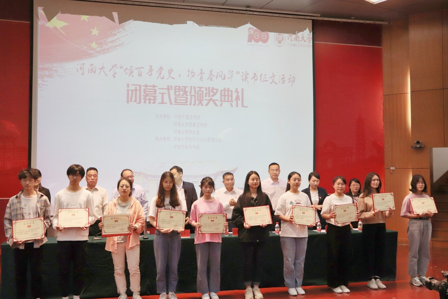 校党委学生工作部部长、学生处处长王友成宣读《关于表彰河南大学庆祝建党一百周年读书征文活动获奖集体和个人的决定》。在热烈的掌声中,在主席台就座的领导嘉宾为获奖个人及集体颁奖。
