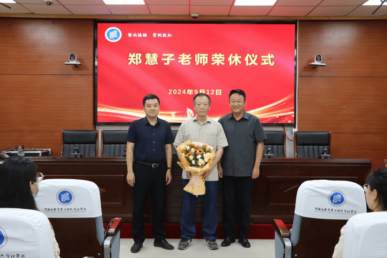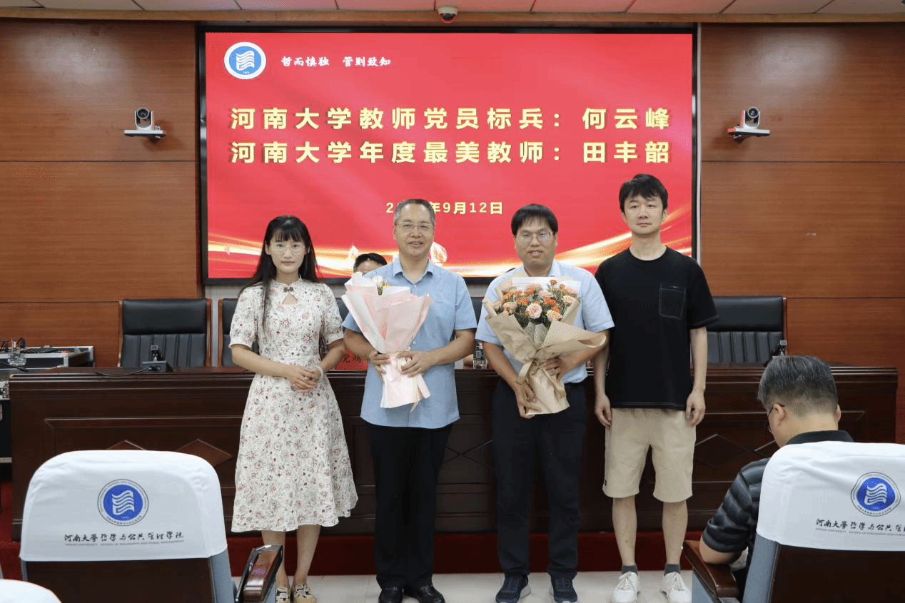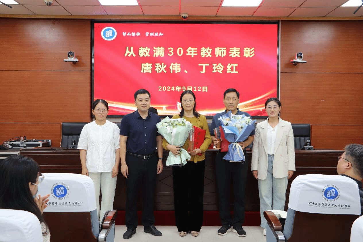 甘于奉献育桃李,薪火相传树榜样。在热烈的掌声中,四名新入职教师为河南大学首批“党员标兵”何云峰、2024年度河南大学“最美教师”田丰韶以及从教满30年教龄的唐秋伟、丁玲红老师奉上鲜花,院长姬志闯为唐秋伟、丁玲红二位教师颁发从教满30年证书和奖杯。