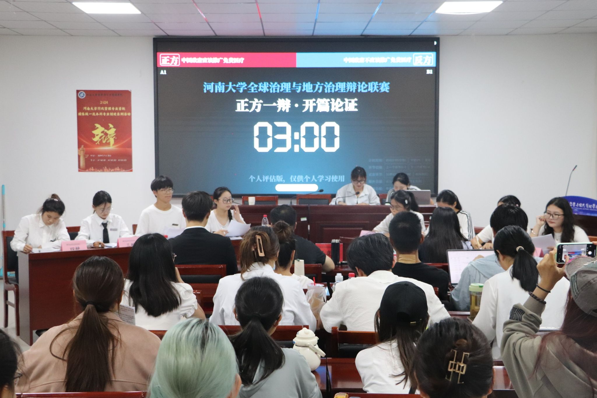 行政管理专业“全球治理与地方治理(2024年度)”辩论联赛第五轮比赛于院楼411举办,2021级韦梦梦、许吉利担任学生评委,部分2022级,2023级行政管理专业学生到场观赛。