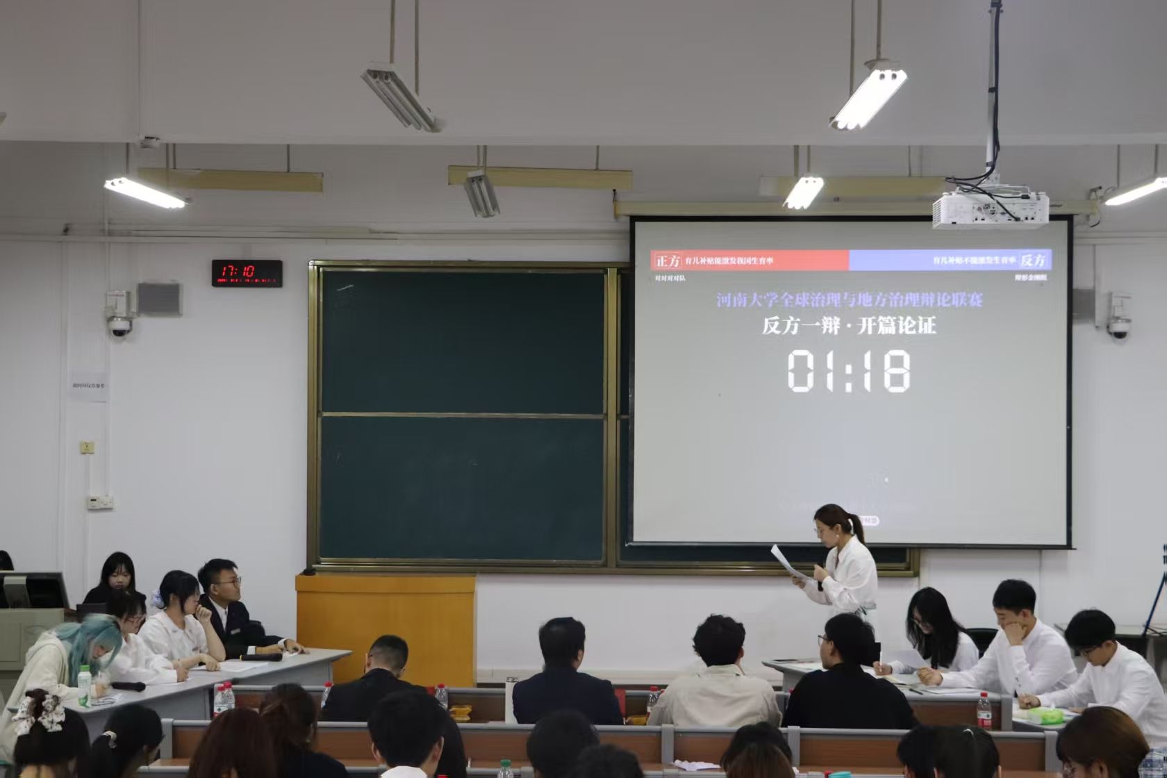 第二场比赛,B1队与B2队围绕“育儿补贴政策能否激发我国生育率”展开辩论,正反方辩手全程展现出清晰的逻辑脉络与精确的语言表达,面对对手从容回应,言辞犀利且论证严密。在紧张激烈的攻防交锋中,双方不断深化论点,以极具感染力的陈述层层递进,将比赛氛围推向高潮,呈现出一场思想与表达交融的视听盛宴。