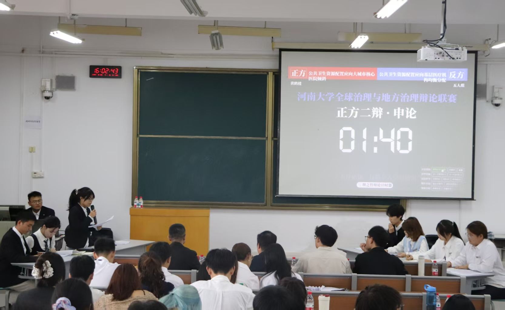 首场比赛,A1队就“公共卫生资源配置应向大城市核心医院倾斜还是基层医疗机构倾斜”与A2队展开激烈交辩。正反双方辩手围绕民生关切议题,结合政策实践、数据案例展开深度交锋,呈现了一场兼具专业深度与思辨魅力的对决。自由辩论环节双方辩手思路清晰、反应敏捷,既引经据典拆解对方逻辑,又以鲜活案例巩固己方立场,比赛氛围持续升温。