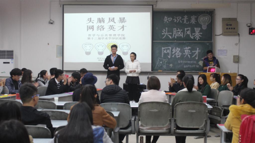 11月13日下午,哲学与公共管理学院“头脑风暴·网络英才”知识竞赛决赛在金明校区综合楼2202顺利举行。初赛晋级的18名选手随机组成六支队伍参赛。