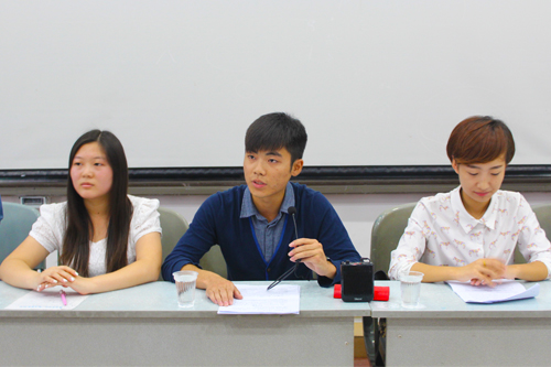 2014级新老生经验交流会在金明校区综合教学楼2406教室顺利举行。院团委副书记姚琛、学生会主席韦元智、秘书长兼辩论队队长林歌、副主席吴怡秋、2013级年级长孟辰、学霸宋金明、青年学社会长吴海良出席会议。