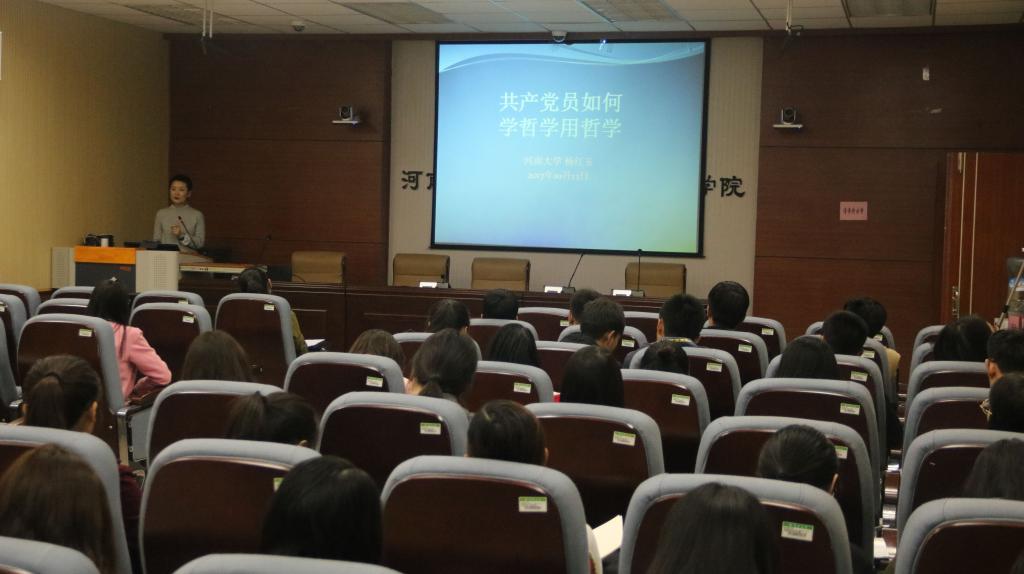杨红玉引用习近平总书记在全国哲学社会科学工作座谈会上的重要讲话,指出哲学社会科学作为人们认识世界、改造世界的重要工具,理应担负起强大中华民族思想与文化的历史使命。她分别从学问与学科分类的角度阐释了“什么是哲学”,并简要介绍了哲学发展的历史脉络,阐述了哲学作为一门重要学科在培养人理论思维方面的重要作用。她从把好“总开关”、防止“软骨病”、建立“命运共同体”三个角度解读了共产党员学习哲学的原因。谈到共产党员如何学习哲学这一问题时,杨红玉强调要加强学习研究当代的马克思主义,建立马克思主义的基本立场、观点与方法,坚持用科学理论武装头脑、指导实践,真正做到学而信、学而行、学而用。