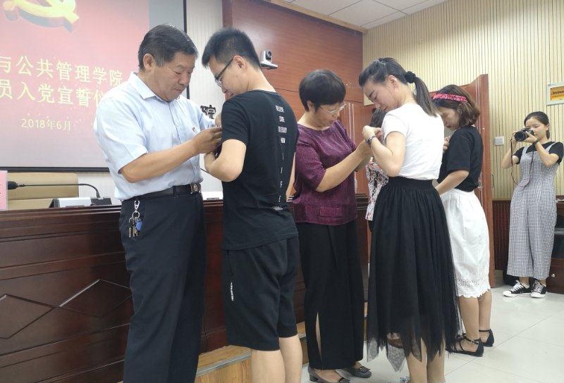 党委委员为新党员佩戴了党徽。