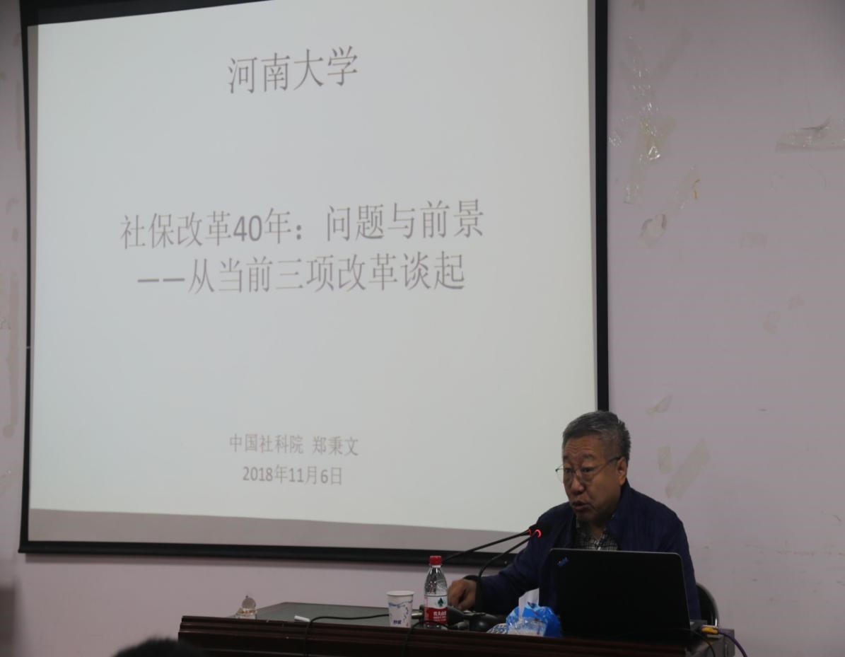 及所有参与讲座的成员向郑秉文教授的到来表达热烈欢迎的同时简单介绍了郑秉文教授在社会保障领域的突出贡献。为了更好地集中听众的关注,郑教授以当前社会保障领域中的热点问题引出本次讲座的主题,以历史方法论的视角向大家清晰讲述改革开放以来我国社会保障制度的发展历程。结合具体实例讲解国内养老金基金区域失衡的现象并给出自己独特的新颖见解。参与讲座的老师和同学利用互动环节积极地向郑教授提问求解,针对所提的每一个问题,郑教授站在自身的学术立场一一给予答疑回应。