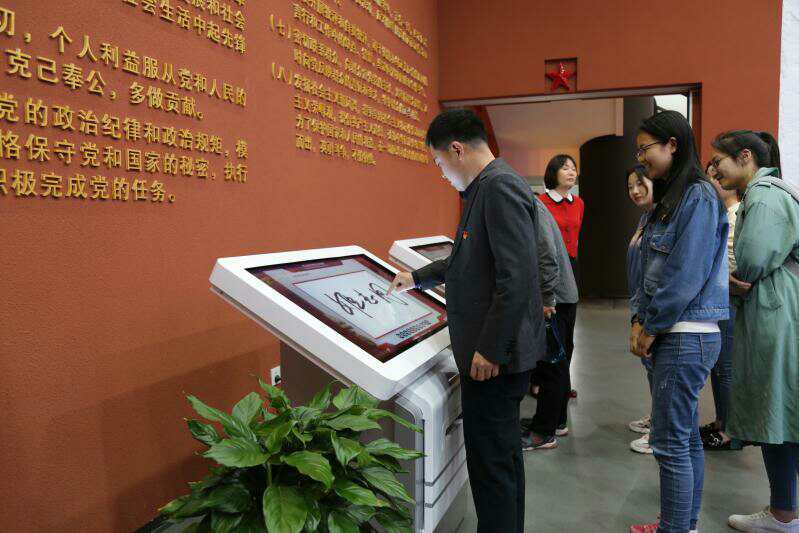 在讲解员的详细解说下,党员同志们通过一张张图片、一页页史料、一段段视频,透过声、光、电等多种方式了解了开封惨烈抗战历程,改革开放以来的重大事件、主要人物、历史脉络和发展成就,体悟了习近平总书记视察开封时的谆谆嘱托,学习了焦裕禄在开封工作生活的感人事迹。在参观过程中,成员们认真聆听讲解,不时驻足观看,认真低头做笔记。参观学生李婕激动地说道:“在宣誓厅看到五代领导人的讲话,感受到中国共产党精神的代代传承,在党的带领下,我们会越来越好。我要学习焦裕禄精神,认真对待自己的学业、工作,不辜负时代赋予我们青年学生的使命。”