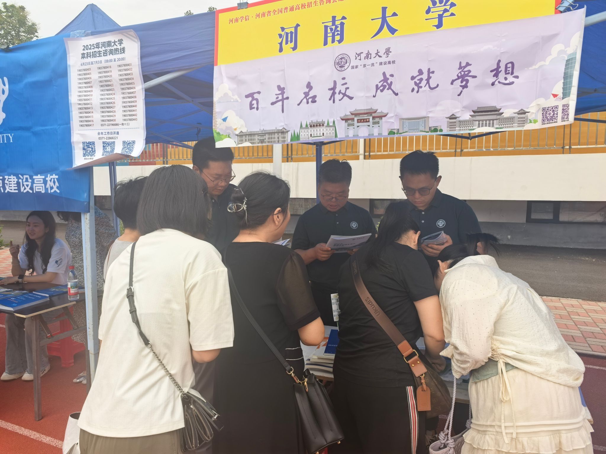 招生宣传组在平顶山市第一中学设置招生咨询展位,吸引了众多师生前来咨询。展位上摆放着精美的招生宣传资料,包括学校简介、专业设置、历年录取分数线等,方便同学们全面了解河南大学的办学特色和优势专业。老师们热情地为前来咨询的同学们答疑解惑,详细介绍了学校的学科建设、师资力量、校园文化以及就业前景等情况,让同学们对河南大学有了更深入的认识。