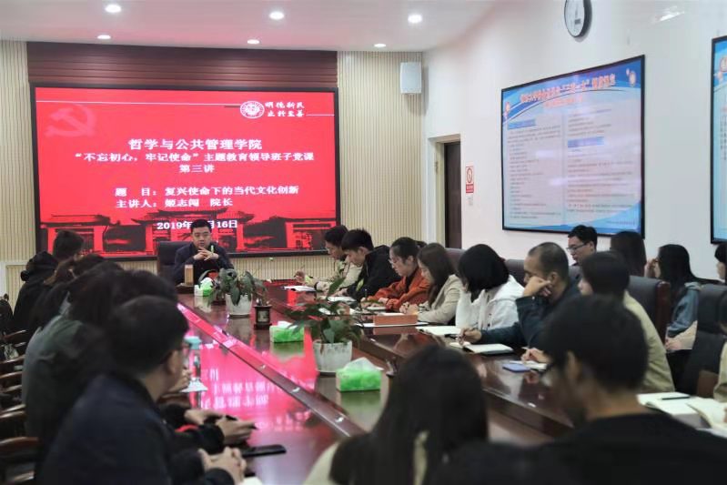 院长姬志闯同志以《复兴使命下的当代文化创新》为题为入党积极分子上党课。他从中国文化的历史渊源谈起,主要针对中国传统文化和外来文化之间的互动对当代中国文化的影响来讲述。他认为大国崛起之后,对文化有更高的需求,进行当代文化创新非常有必要的。随后,他从“文化”一词的词源学角度,对其进行阐述,并由此推出我们需要在社会动态的实践过程中,进行文化创新。当代文化创新要在以下两方面进行:一是文化自觉,文化创新的前提是文化自觉,了解本土文化并对自身危机的自觉;二是文化重构,当代文化创新需要在对中国文化模式进行总结和反思的基础上,赋予文化生命力,而不是简单的要素组合。他认为文化的生存之道存在于文化的内在力量,文化创新之路也应以近一百年来中国文化所有的成果为基础。