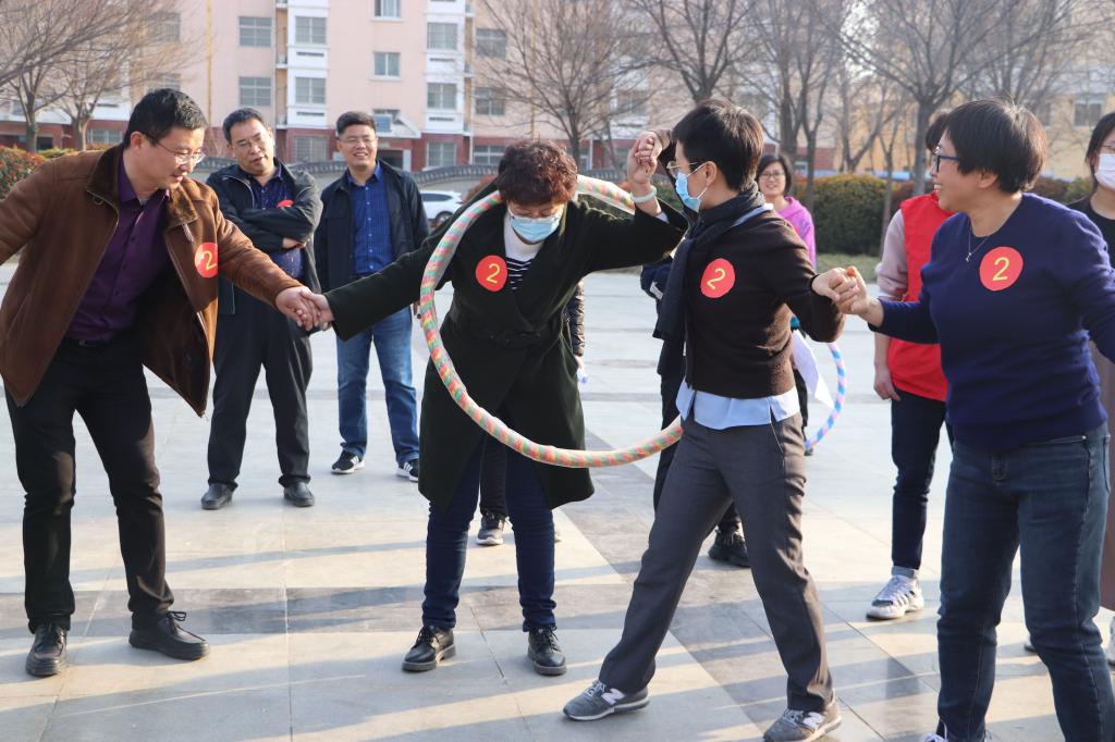 工会在南苑小广场举办迎“三八”教职工趣味运动会。本次运动会包括“呼啦圈接力”、“沙包掷准”和“击鼓颠球”三个项目,参赛选手分为四支队伍进行比赛。