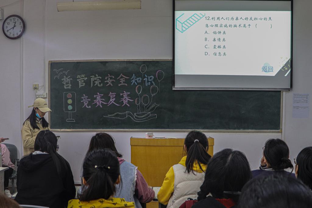 安全知识竞赛分为初赛和决赛两部分,初赛采用笔试的形式,以政治安全、金融安全、校园安全、宿舍安全为主,对学生的生活经验积累和基础安全知识进行考察。通过初赛选拔的十二名选手分为三个小组进行决赛比拼。参赛各组合众志,集众力,为我们呈现出了一场精彩绝伦的比赛,无论是必答环节各选手的沉着应对还是情景演绎环节呈现的生动又不失教育意义的表演,都充分展现出选手们充足的安全知识储备。比赛场上气氛紧张活跃,观众们掌声连连。经过激烈的角逐,第三组凭借优异的表现斩获一等奖,第二组获得二等奖,第一组获得三等奖。