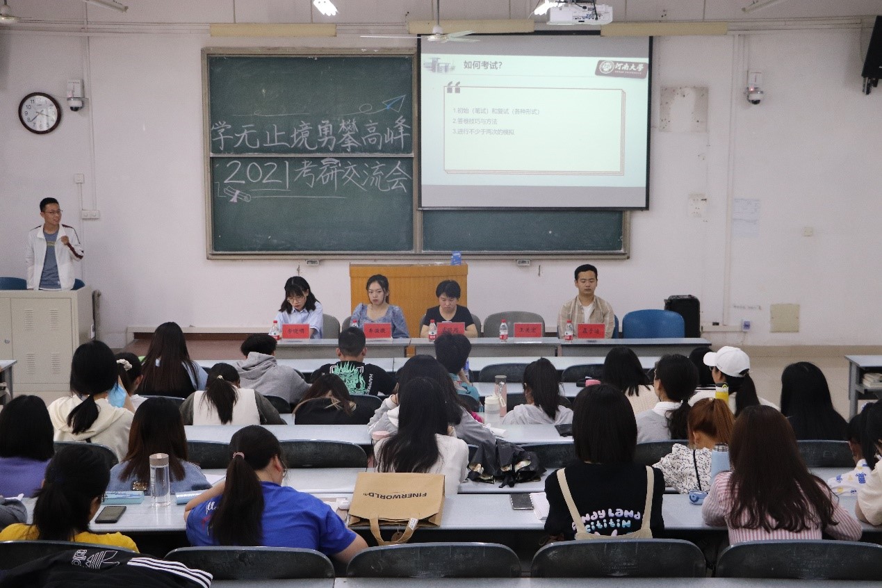 在金明校区综合楼2101举办“研路有你”考研交流会。聂子迪、王关宏、车薇薇、李晓明和武路路五位优秀学子受邀为同学们做考研经验分享,spbo即时比分live