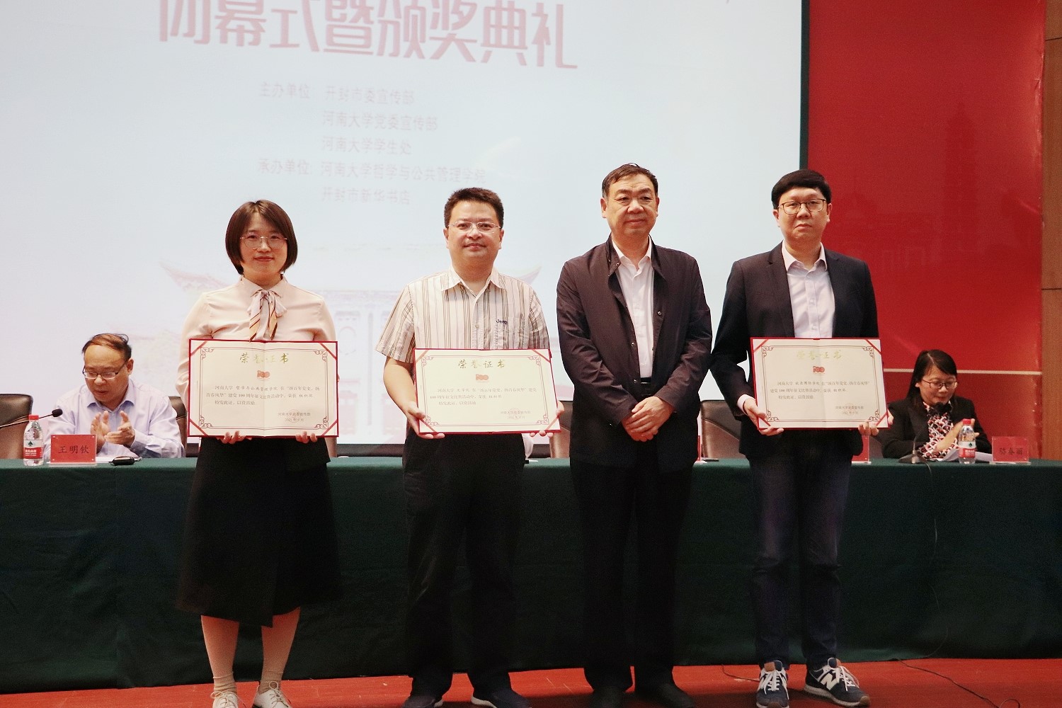 校党委学生工作部部长、学生处处长王友成宣读《关于表彰河南大学庆祝建党一百周年读书征文活动获奖集体和个人的决定》。在热烈的掌声中,在主席台就座的领导嘉宾为获奖个人及集体颁奖。