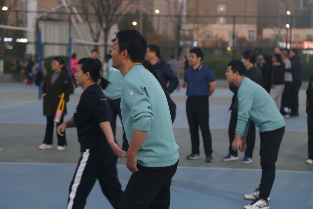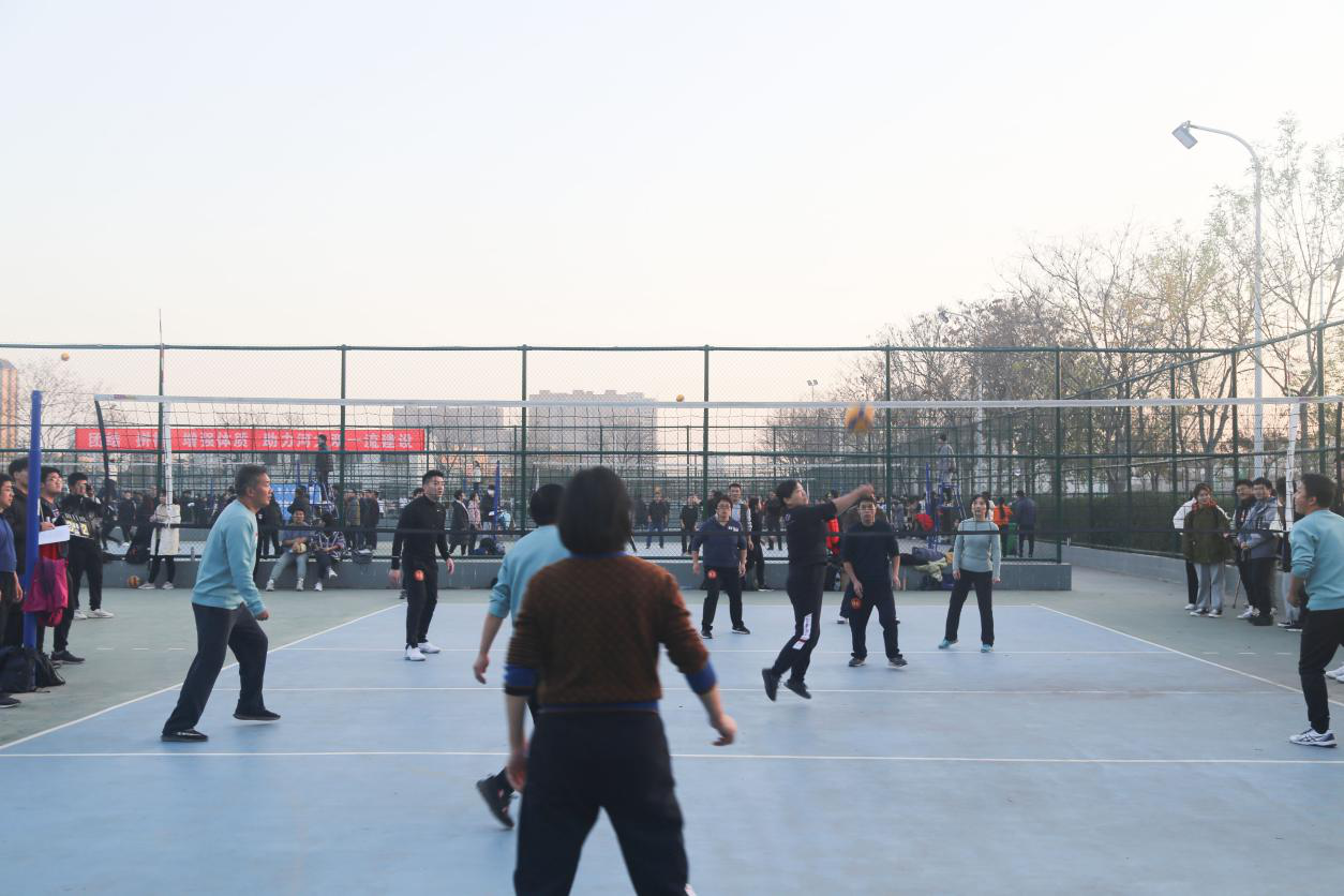 寒风划长空,排球凌空跃。伴随着一声哨响,党鸿军一个高抛发球,掀开了整场比赛的帷幕。紧接着,起跳、拦网,唐秋伟接球后大力扣球得分。场上的女教师更是巾帼不让须眉,郑雪飞稳接多个一传,刘素姣蜻蜓点水般的巧打轻吊。老师们一个个攻守有度,配合默契,每一次精彩的传球与得分都引来欢呼阵阵,现场的气氛渐进高涨。