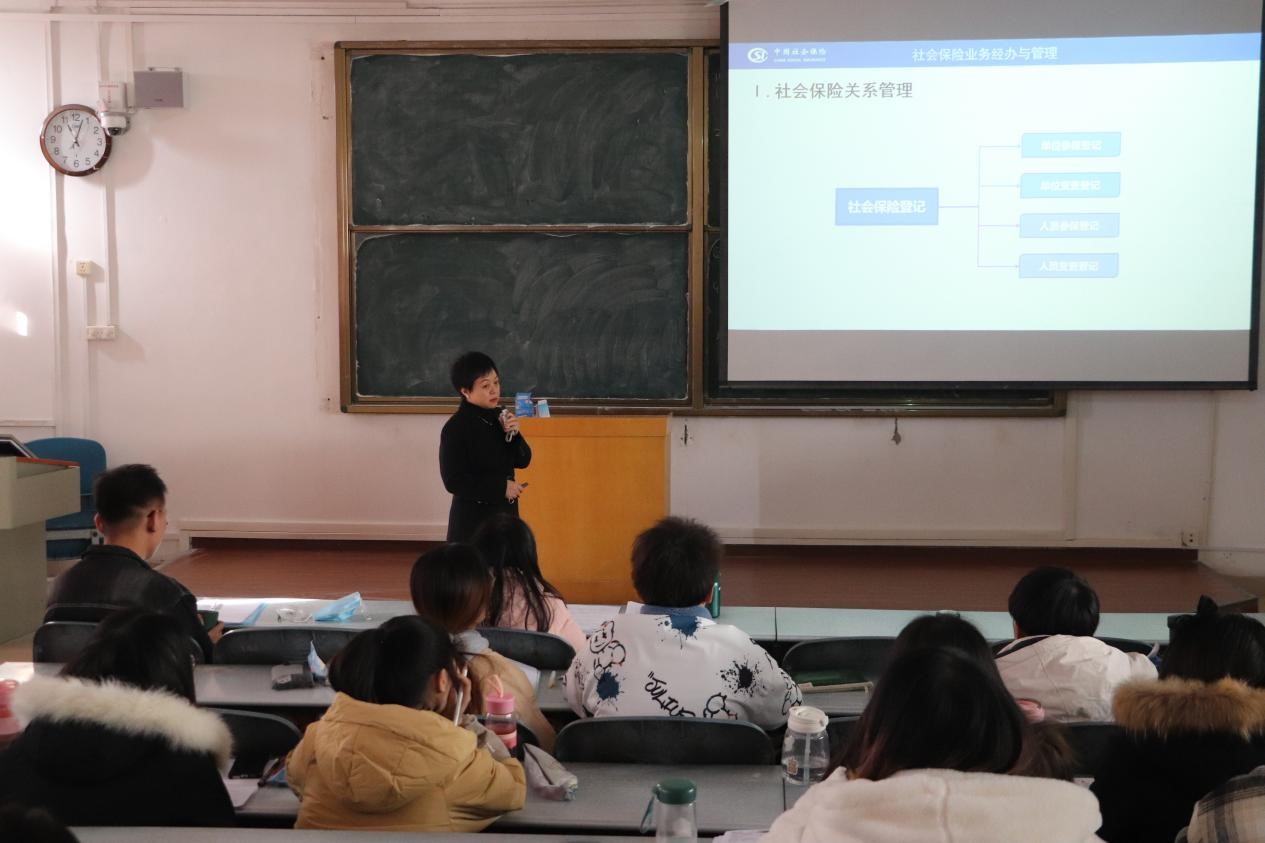 崔媛媛首先结合社会保险各险种的建立与改革,条理清晰地将社会保险经办机构的设立与发展过程向在座的教师和学生们做出详尽讲解。其次,介绍开封市社会保险信息管理系统的建设历程,并将当前开封市管理社会保险的方式做出相应解说。最后,从社会保险关系、社会保险费征缴、社会保险待遇、社保基金管理四个方面诠释了社会保险的业务经办过程与需要重点关注的问题。崔媛媛在讲述过程中以通俗的语言,并穿插各种真实的案例,使得在场的教师和学生收益颇丰。