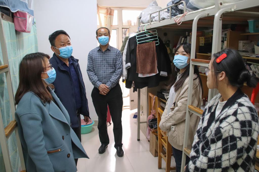领导一行深入学生宿舍进行走访调研,耐心了解同学们的校园生活现状,叮嘱大家要服从学校管理,勤洗手、常通风、戴口罩、少出门、不聚集,注意宿舍卫生和自我防护,保持身心健康,有问题及时反映。