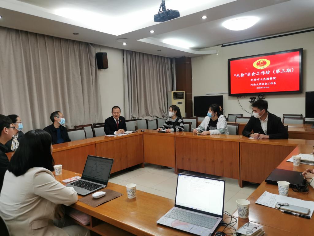 社会工作系白雪苹、付光伟两位老师和2020级社会工作专业本科生代表聂晓彤、赵俊培、王立宸参与了此次活动。此次工作坊由开封市人民检察院第七检察部赵永建副主任主持。与前两期工作坊不同的是,郑州市金水区青荷橄榄社会工作服务中心作为开封市检察院购买社会工作服务的承接方也应邀参加了此次活动。