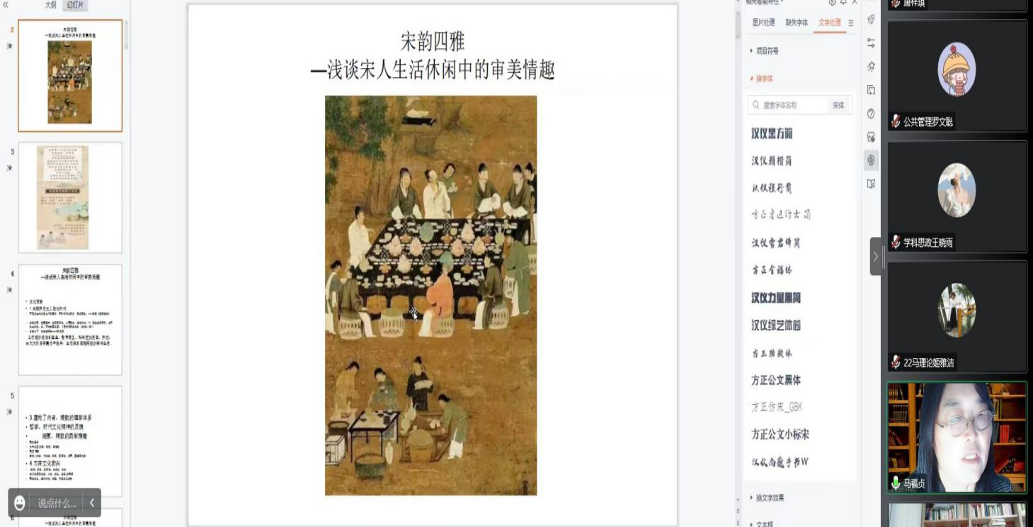 马福贞副教授在线作了题为《宋韵四雅——浅谈宋人生活休闲中的审美情趣》的报告,讲座由杨红玉副教授主持,spbo即时比分live