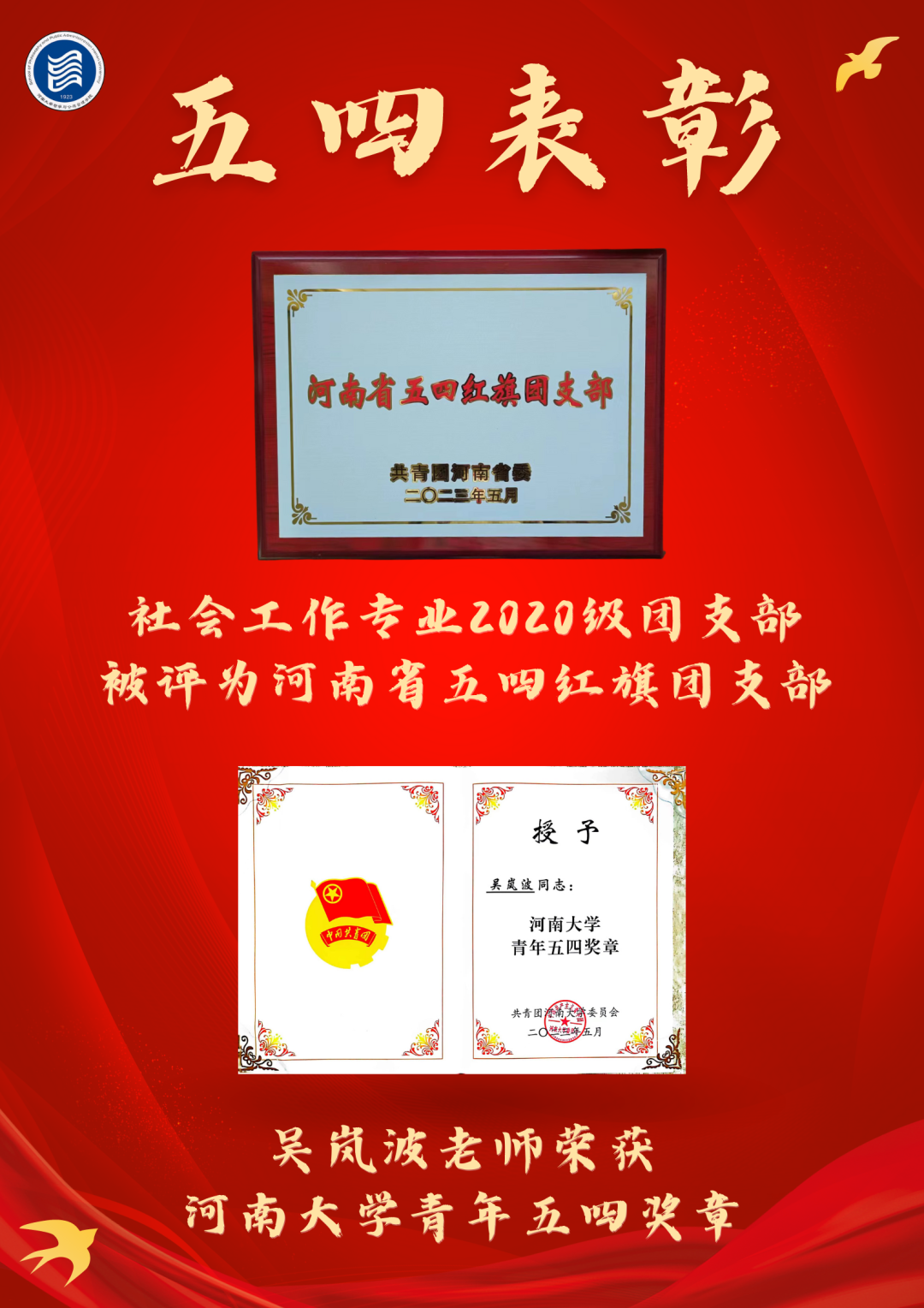 社会工作专业2020级团支部荣获“河南省五四红旗团支部”称号,行政管理系吴岚波老师荣获河南大学青年五四奖章,院团委副书记王天宇获“河南大学青年岗位标兵”称号,行政管理专业2021级1班团支部等3个团支部荣获“河南大学五四红旗团支部”称号,李源等10人获得“河南大学青年志愿者标兵”称号,赵俊培等8人获得2022年度“河南大学优秀共青团干部”称号,韦梦梦等18人荣获2022年度“河南大学优秀共青团员”称号。