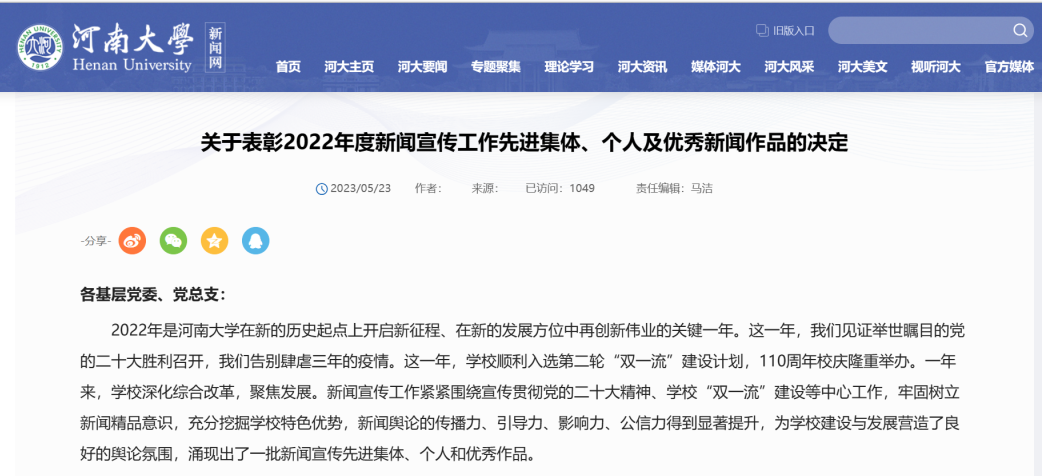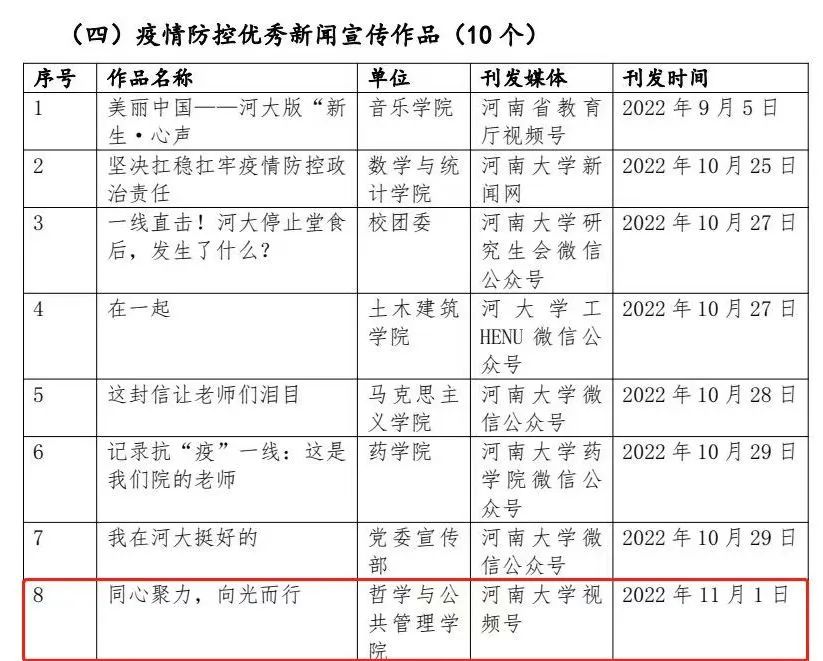 作品《同心聚力、向光而行》被评为疫情防控优秀新闻宣传作品。王天宇、田馨滦荣获2022年度新闻宣传工作先进个人,魏华秀等9人荣获2022年度优秀通讯员,潘赵红、陈阳荣获2022年度优秀编播员。