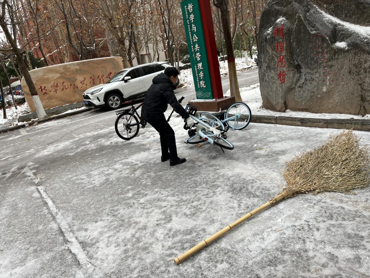 党委清扫积雪号召,从早上到晚上,多次对学楼和南苑餐厅路面上的积雪进行破冰清扫。