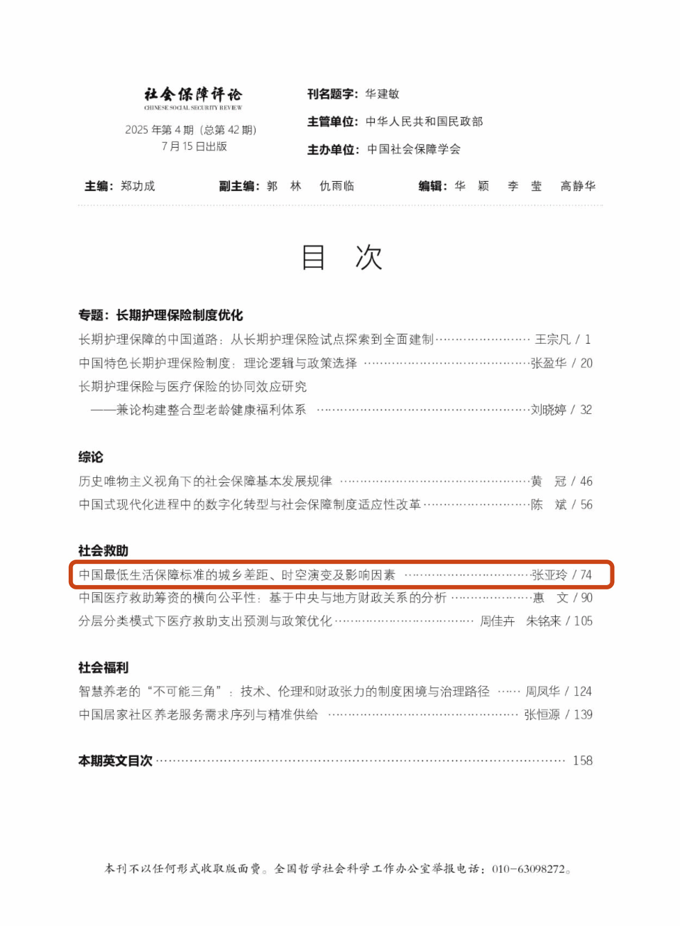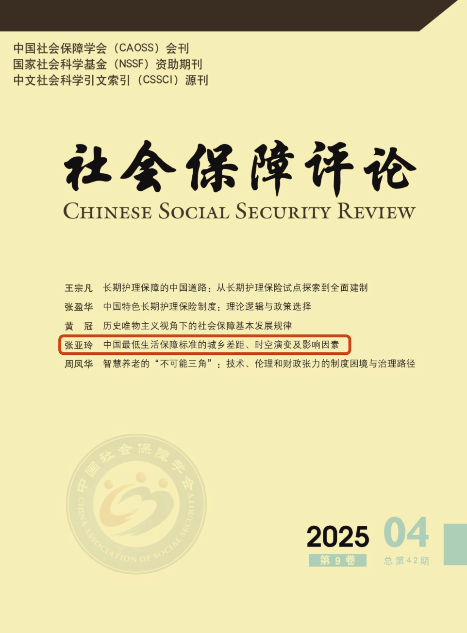 张亚玲老师最新研究成果“中国最低生活保障标准的城乡差距、时空演变及影响因素”在社会保障领域权威期刊《社会保障评论》(2025年第4期)上发表,并成功入选封面论文。