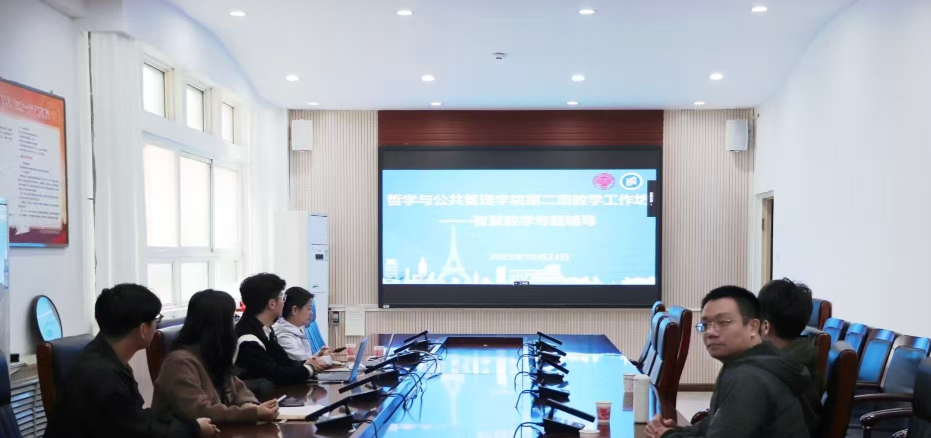 对分享嘉宾的到来表示热烈欢迎。随后,分享嘉宾以智慧教学为主题,系统阐释智慧课程建设的实施现状,深度解读智慧课程建设的理论框架与实施路径,重点探讨AI技术与课程内容体系的融合应用。在交流互动环节,与会教师结合自身教学实践,就智慧教学的可实施性、课程适配程度等问题与分享嘉宾展开深入交流,现场研讨氛围热烈。