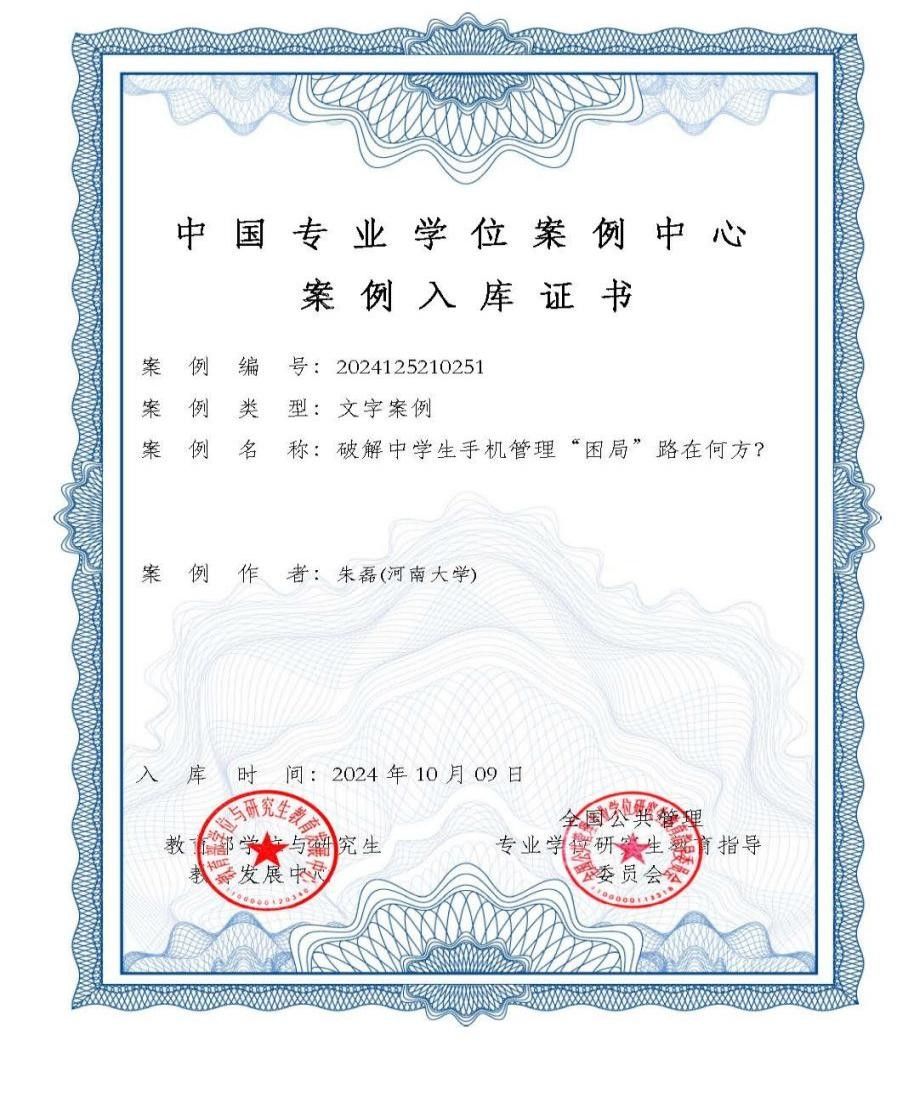 日前,教育部学位与研究生教育发展中心、全国公共管理专业学位研究生(MPA)教育指导委员会下发了新的一批中国专业学位教学案例库入库证书,spbo即时比分live 朱磊副教授编写的教学案例《破解中学生手机管理“困局”路在何方?》成功入选。
